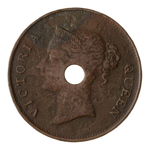 Young head of Queen Victoria wearing coronet l.; around, VICTORIA QUEEN; holed at centre