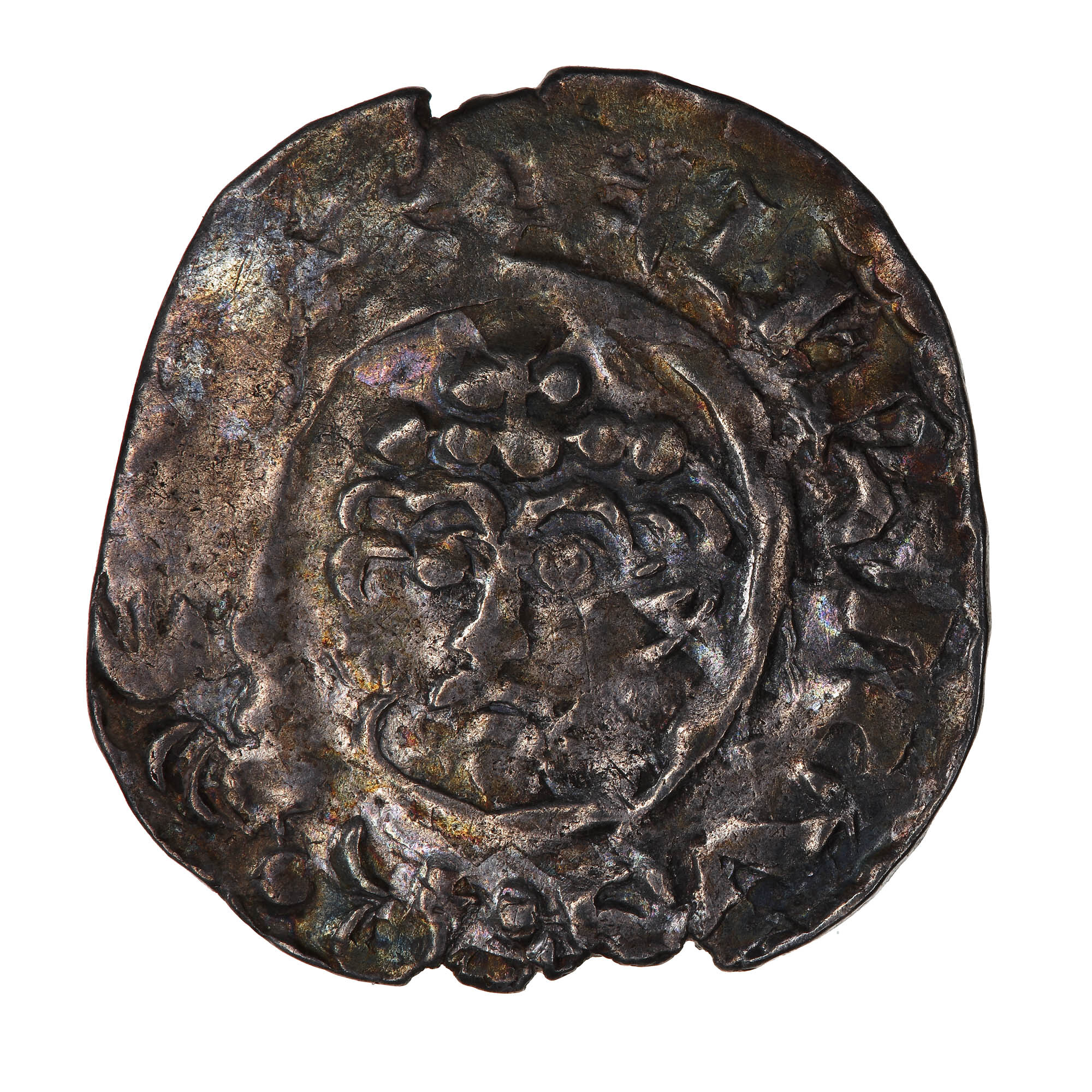 A crowned bust of the King facing within a line circle, holding a sceptre outside the circle; around; HENRICVS REX