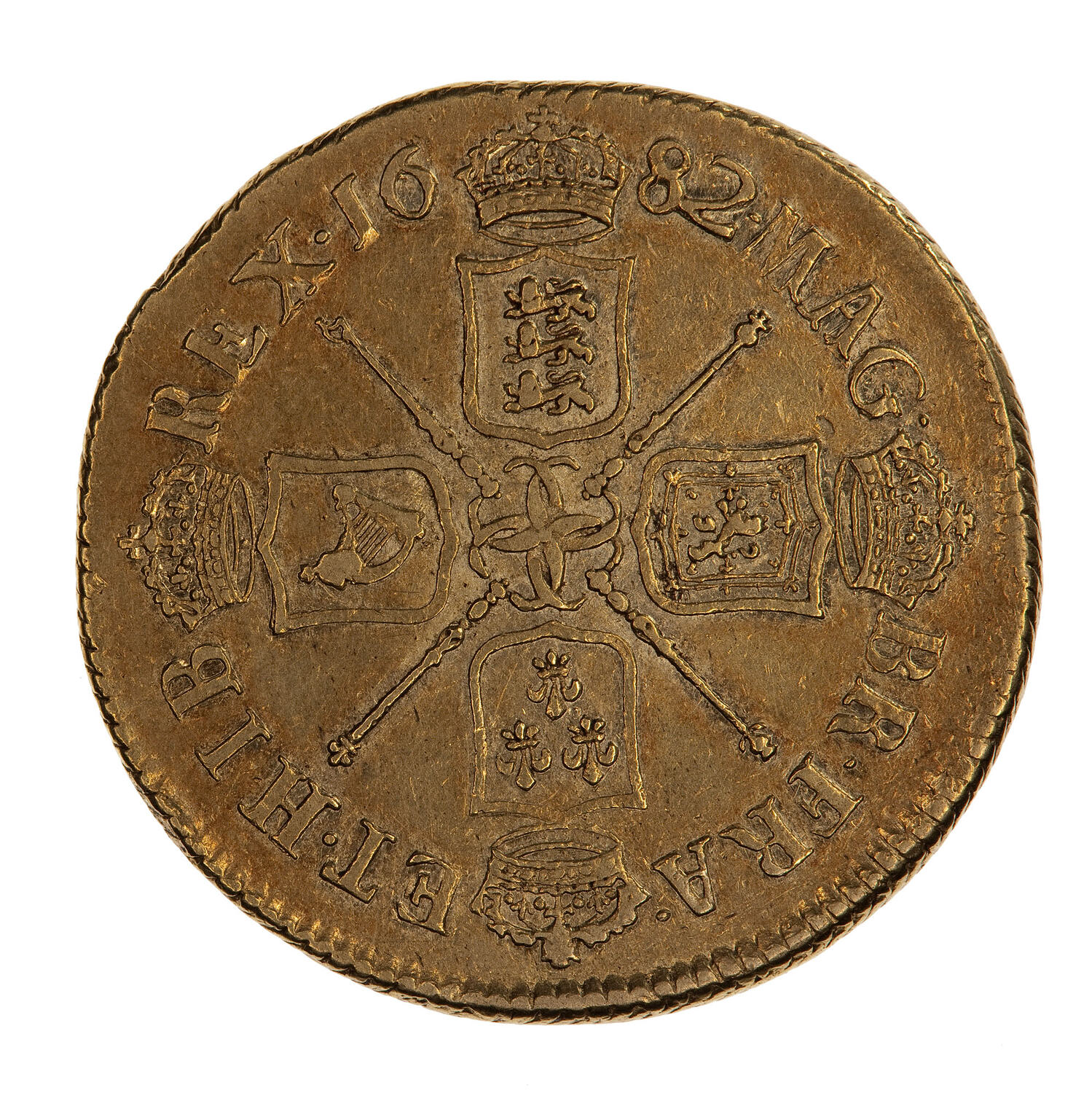 Four crowned shields bearing the arms of England, Scotland, France and Ireland set to form a cross with four interlinked Cs at centre; in angles, sceptres tipped with an orb, thistle, lis and harp; around, MAG BR FRA ET HIB REX 1682, the date being divided by the crown above the English shield.