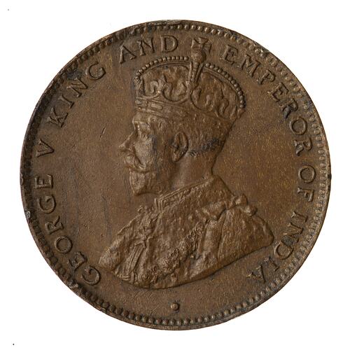 Crowned and draped bust of the King facing left, the King is wearing the Imperial Crown and the ermine Robe of State, the Collar of the Most Noble Order of the Garter, and the Badge of the Most Honourable Order of the Bath; around, GEORGE V KING AND EMPEROR OF INDIA; on bust truncation, the artist's initials, BM