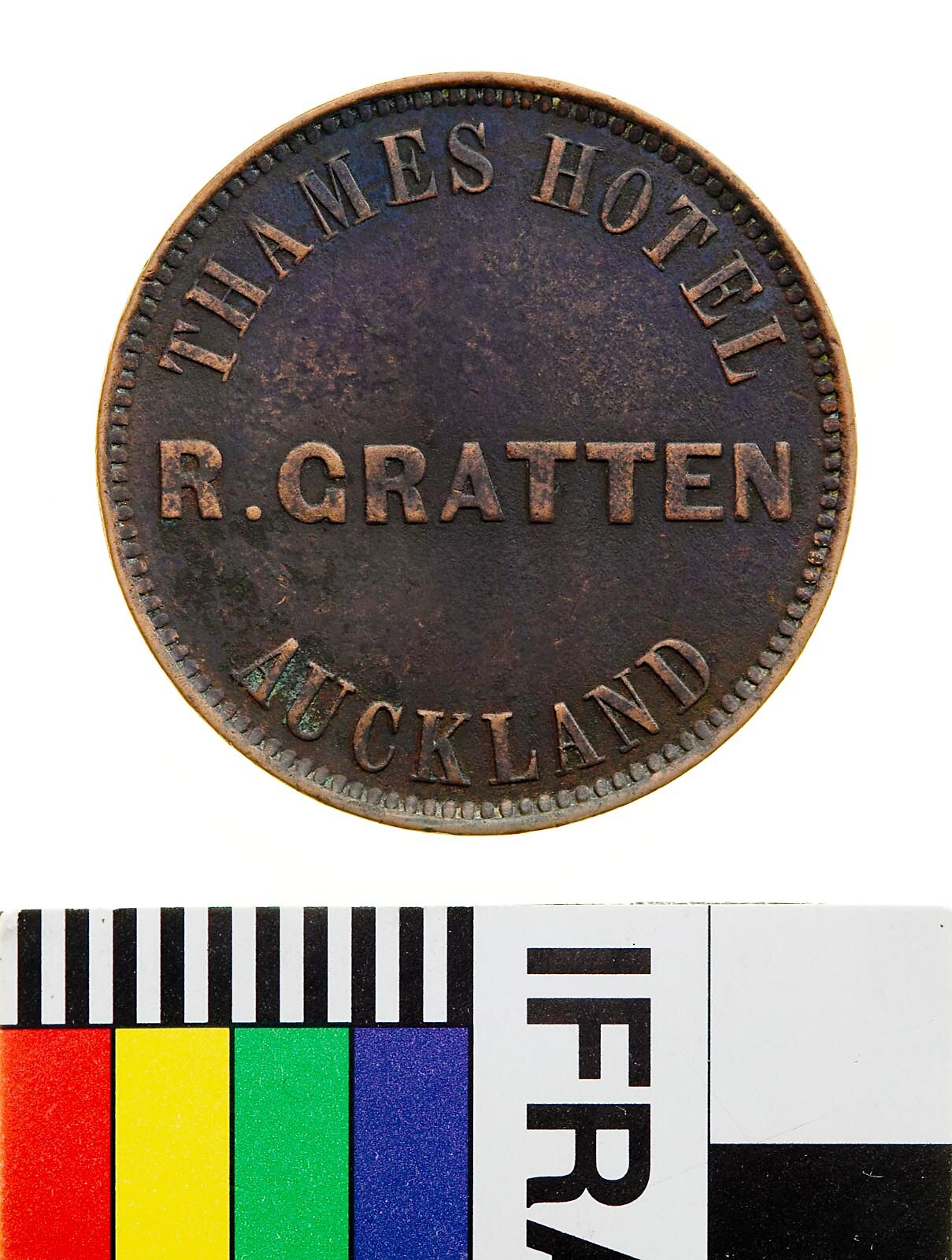 Bronze One Penny Token, mint unknown. Issued by R. Gratten, Thames Hotel, Auckland, 1872. The Thames Hotel, was run by R. Gratten in 1872. It stood at the corner of Queen and Customs Streets in Auckland. Robinson suggests that the name connects the hotel with the gold fields in New Zealand's South Island, and that fights between patrons at the end of the evening were a common event.