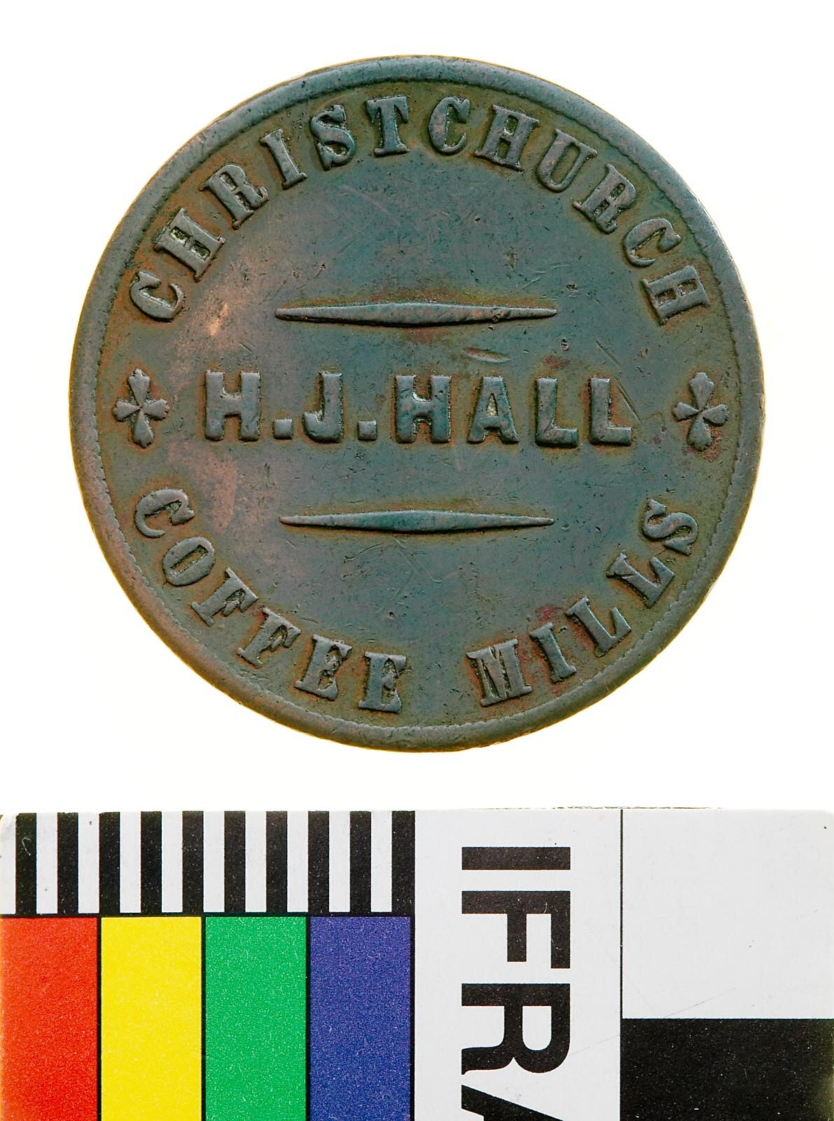 Obverse: H.J. HALL CHRISTCHURCH COFFEE MILLS Reverse: H.J. HALL FAMILY GROCER WINE & SPIRIT MERCHANT