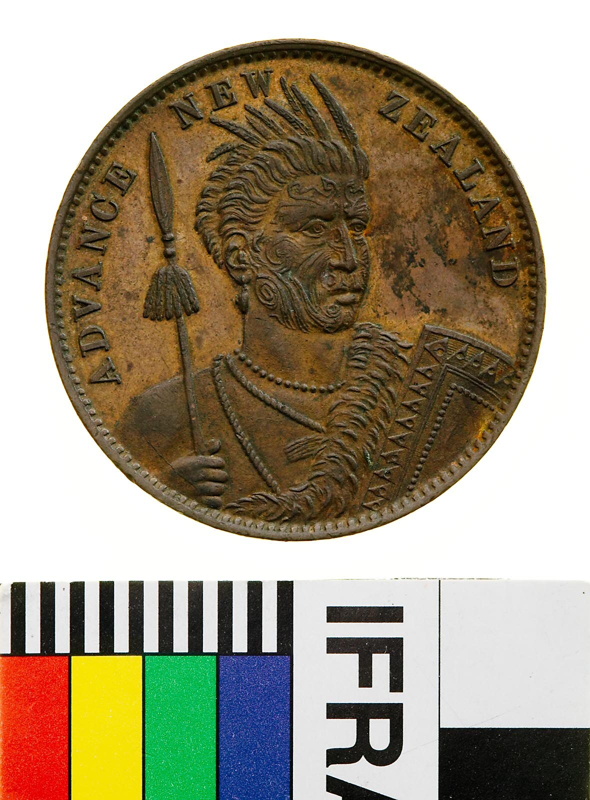 A round copper token (34 mm diameter). The token features a Maori warrior standing on an island in front of a palm tree. He holds a large square shield on the ground with his right hand and a weapon in his left. The shield is quartered with plants in each sector, a kiwi emerges walking left from behind the shield. In the sea behind the prow of a war canoe can be seen to the left of the kiwi and a mountainous island is seen in the background. Around, NEW ZEALAND The reverse features a bust a Maori warrior facing three-quarters right with tattooed face, wearing a feather headdress and holding a spear in his right hand and shield.