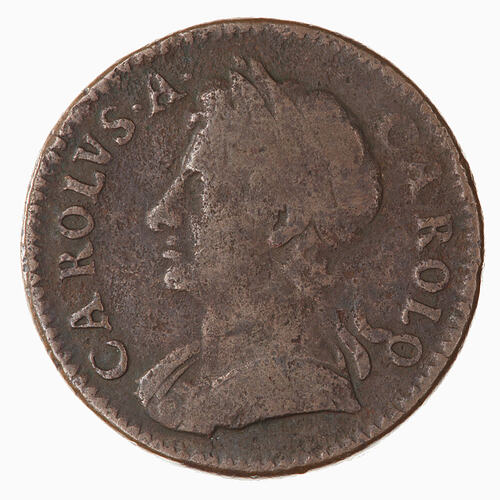 Laureate bust of Charles II wearing armour facing left; around, CAROLVS . A . CAROLO