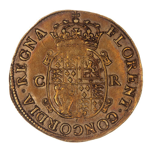 Oval shield, crowned and garnished, quartered with the arms of England and France combined (in 1st and 4th quarters), Scotland and Ireland, dividing the lerrers CR; around, FLORENT . CONCORDIA . REGNA . (translation: United kingdoms flourish)
