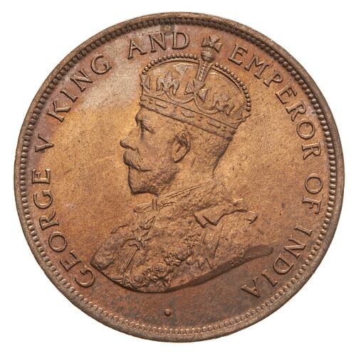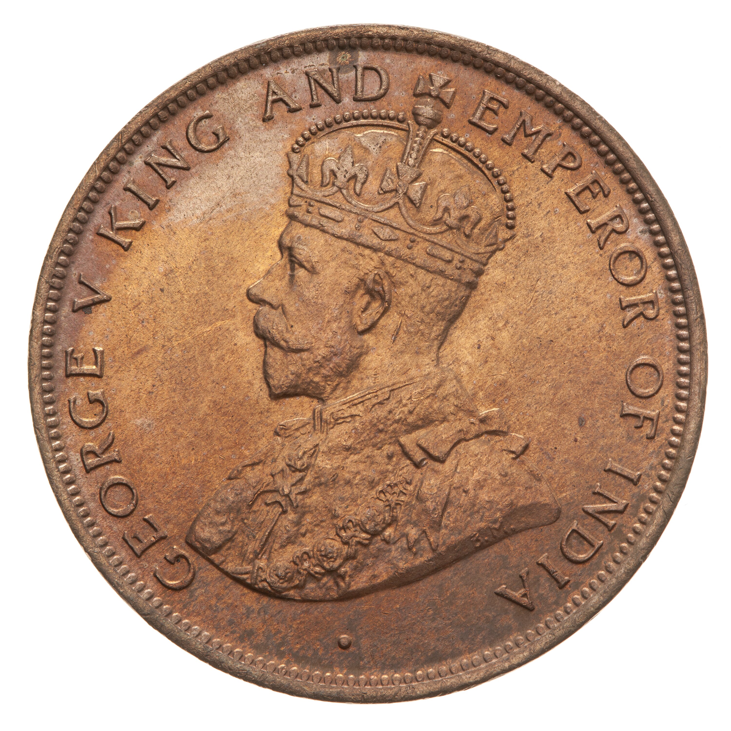 Crowned and robed bust of the King facing left; around, GEORGE V KING AND EMPEROR OF INDIA; on bust truncation in small letters the artists initials, BM