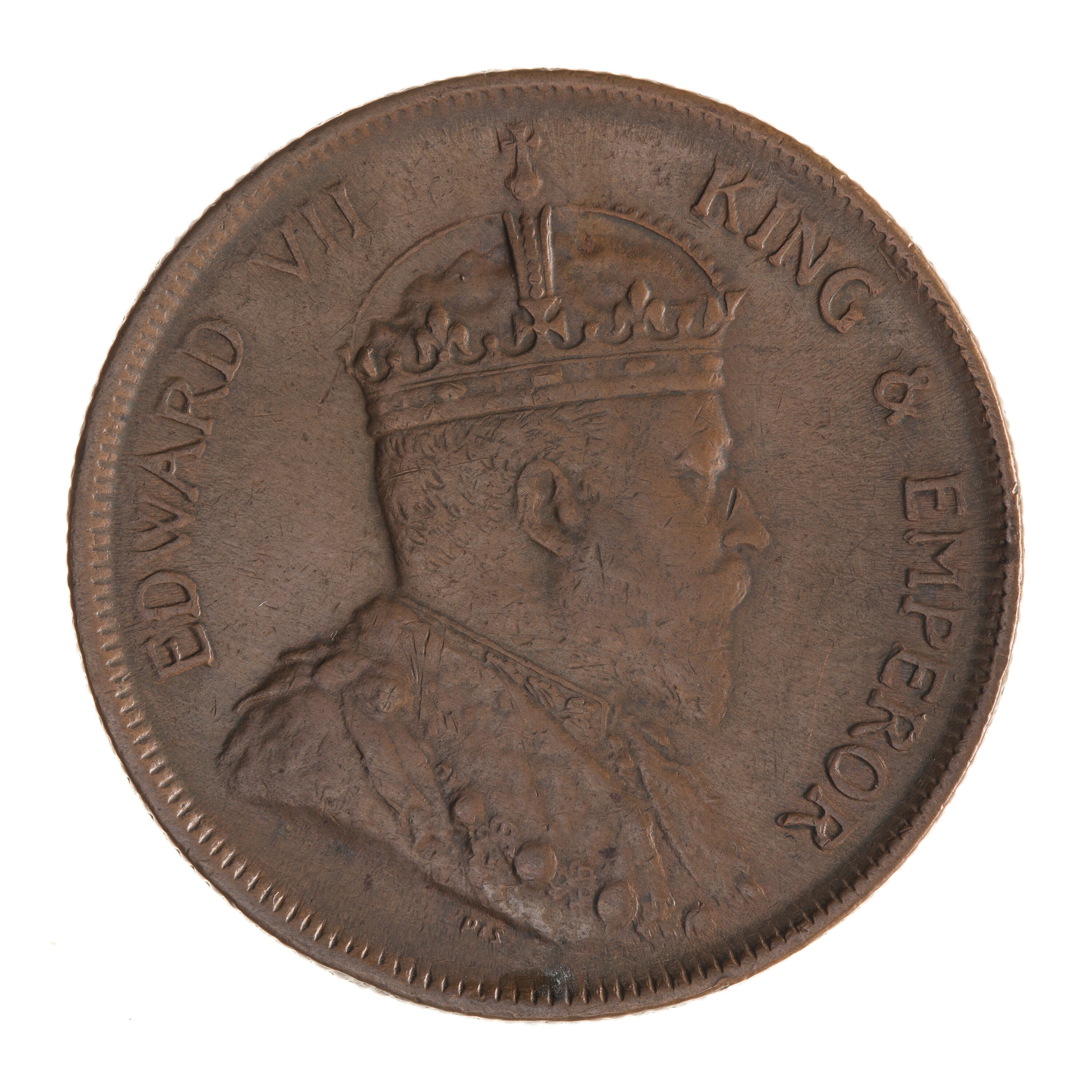 Bust of the King wearing the Imperial crown and an ermine robe with the collar of the Garter and the badge of the Bath; around, EDWARD VII KING & EMPEROR; the artist's initials DES below bust