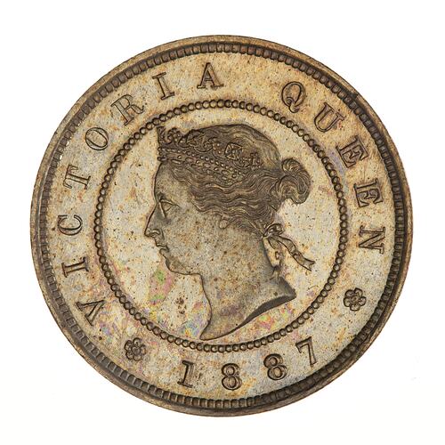 Within a beaded circle, a diademed head of the Queen facing left; around, VICTORIA QUEEN; below between two roses, 1887