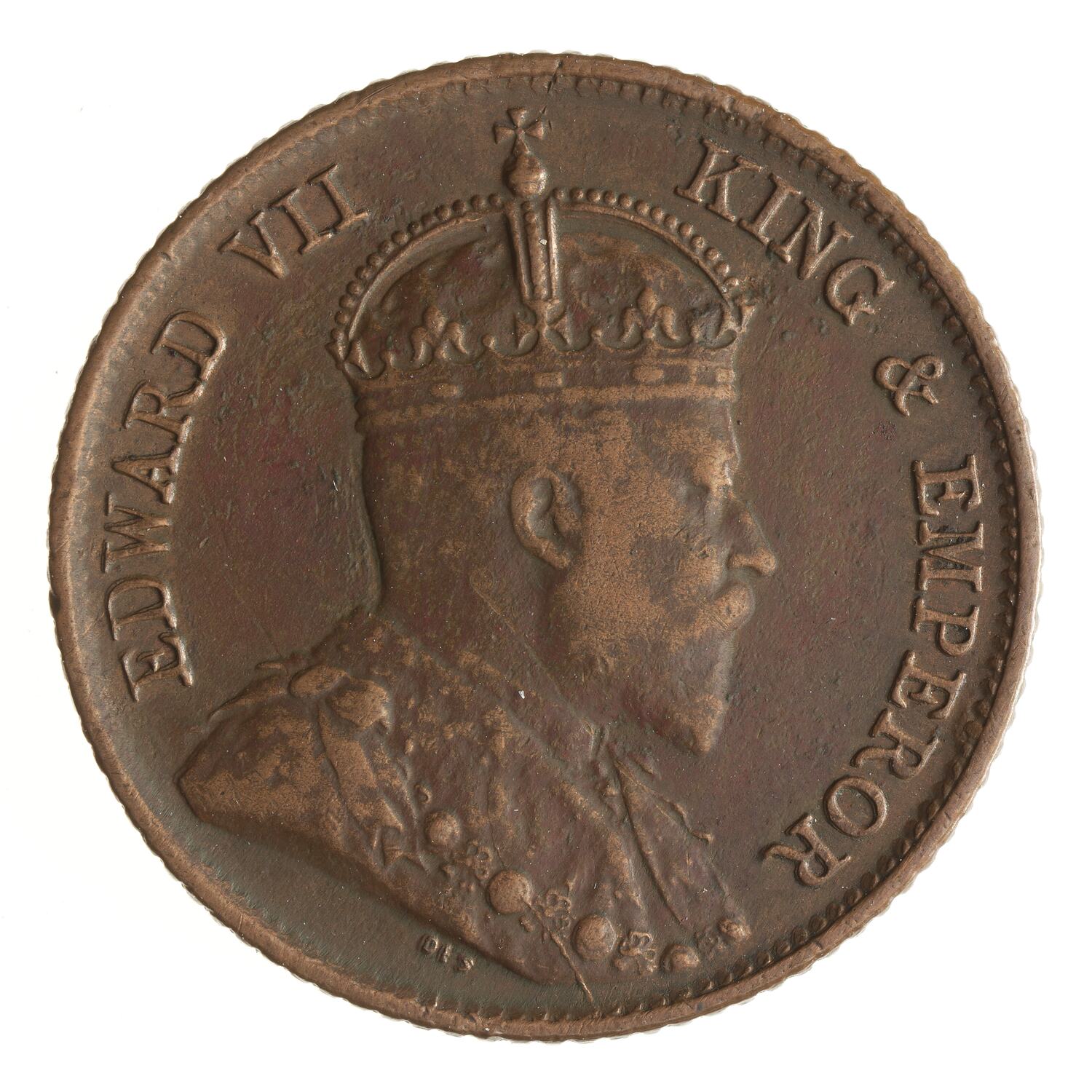 Bust of the King wearing the Imperial crown and an ermine robe with the collar of the Garter and the badge of the Bath; around, EDWARD VII KING & EMPEROR; the artist's initials DES below bust