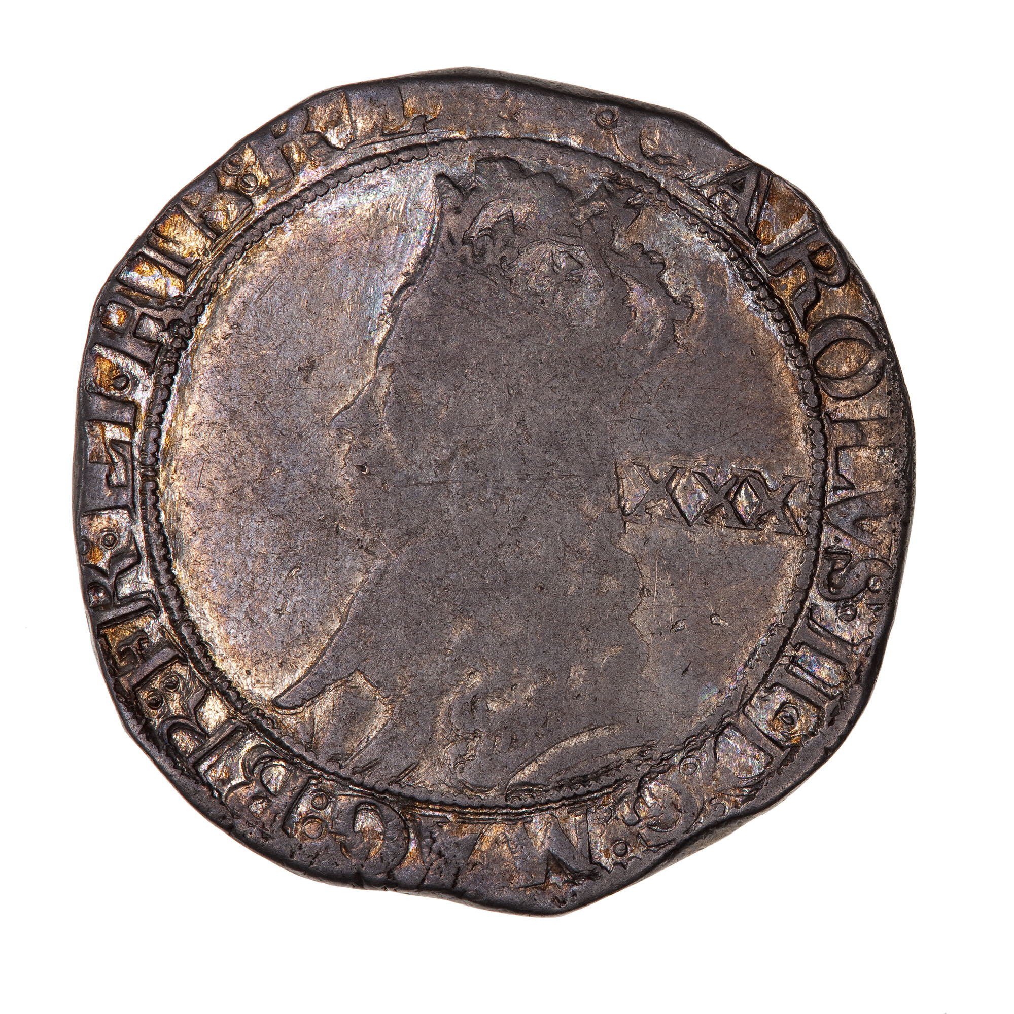 Laureate and draped bust of the King facing left; behind head, XXX; around, (mm. crown) CAROLVS II D G MAG BR FR ET HIB REX, double striking