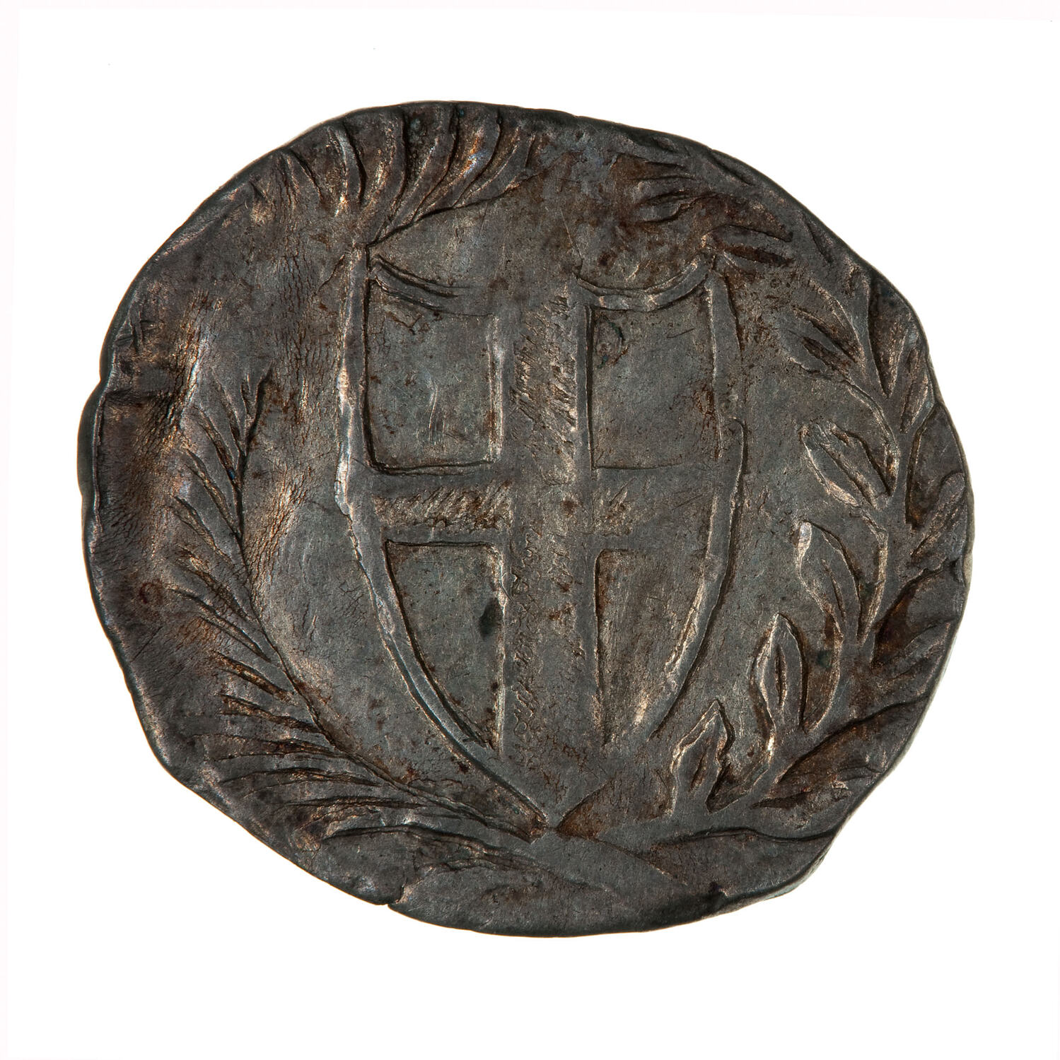 Within a wreath of palm and laurel a shield bearing the cross of St. George