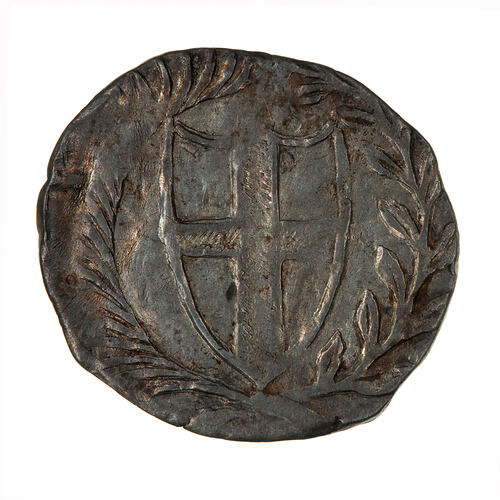 Within a beaded circle two conjoined shields, the one on the left bearing the cross of St. George and on the right, the Irish Harp; above, the denomination in pence, I