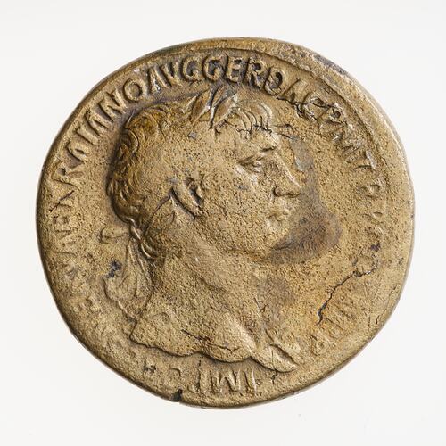 Laureate head of Trajan facing right; around, IMP CAES NERVAE TRAIANO AVG GER DAC P M TR P COS V P P
