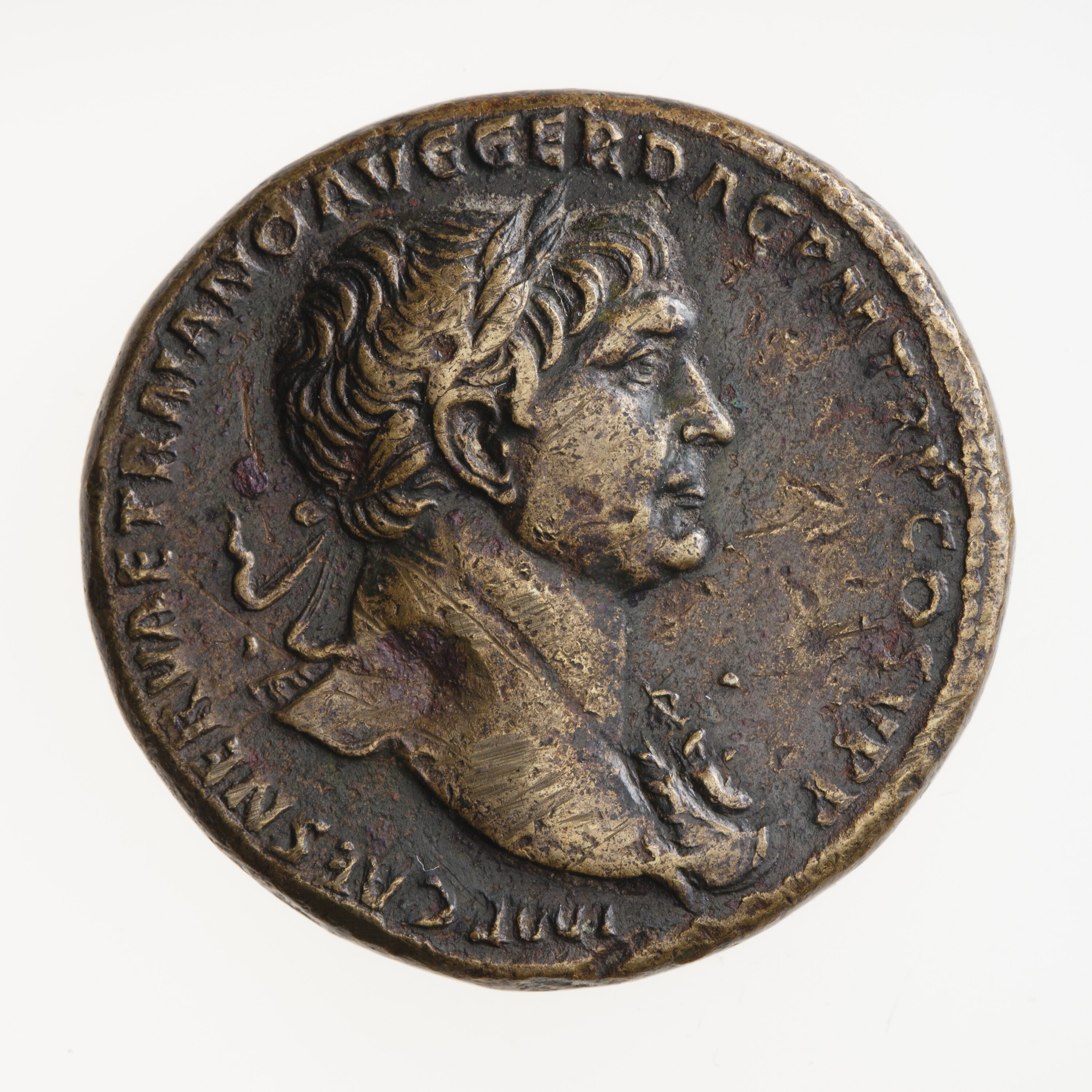 Laureate head of Trajan facing right wearing aegis; around, IMP CAES NERVAE TRAIANO AVG GER DAC P M TR P COS V P P