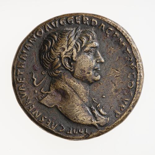 Laureate head of Trajan facing right wearing aegis; around, IMP CAES NERVAE TRAIANO AVG GER DAC P M TR P COS V P P