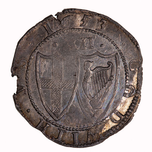 Within a beaded inner circle two conjoined shields, the one on the left bearing the cross of St. George and on the right, the Irish Harp; above, the denomination in pence, XII; around, GOD WITH VS 1653