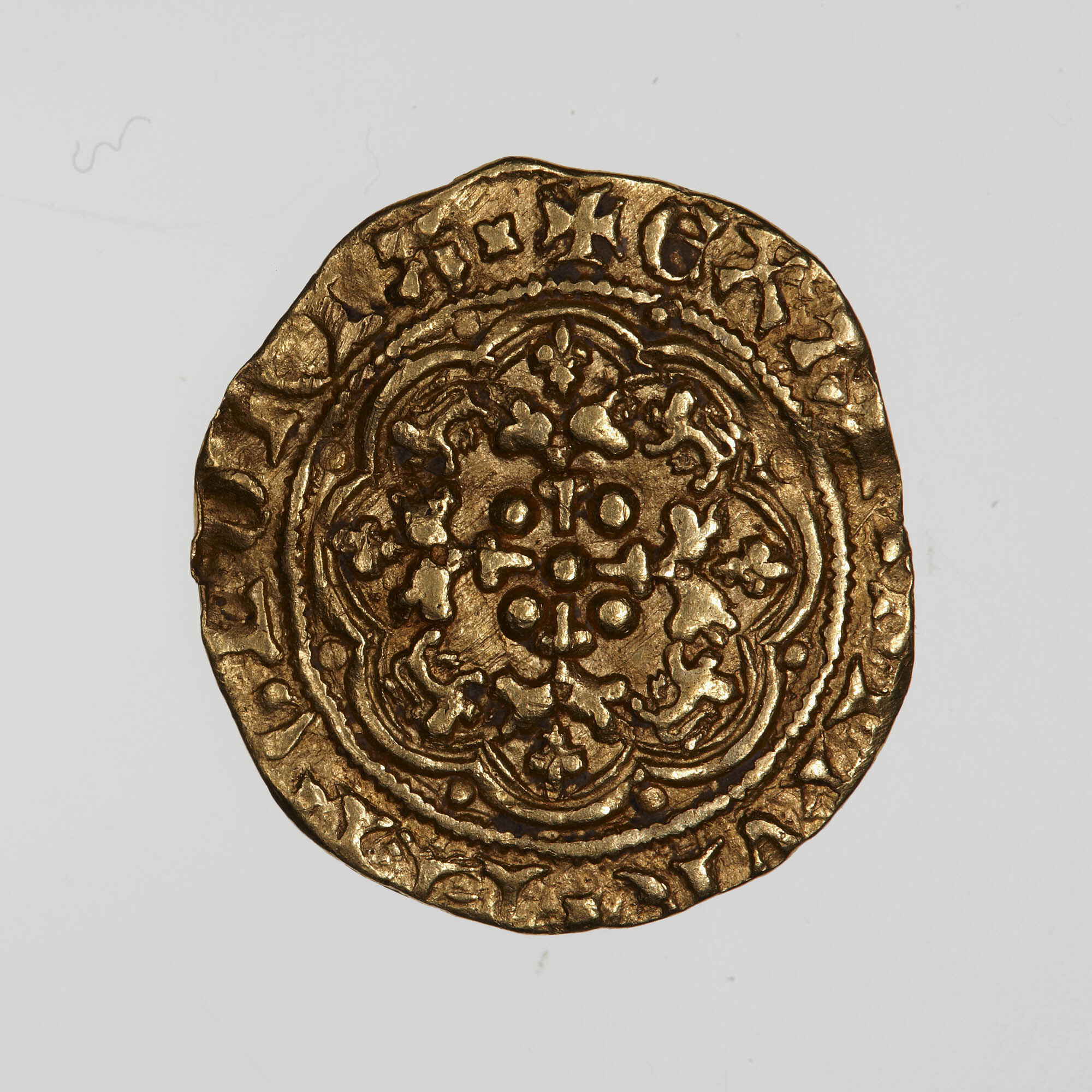 A shield quartered with the arms of England and France within a tressure of eight arches; around, + EDWAR DEI GRA REX ANGL