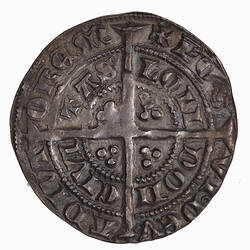 A long cross pattee dividing the legend, three pellets in each arm (annulet in first quarter); around in two concentric circles, (mm cross pattee) POSVI DEV ADIVTOREM - CIVITAS LONDON (translation: I have made God my helper - City of London)
