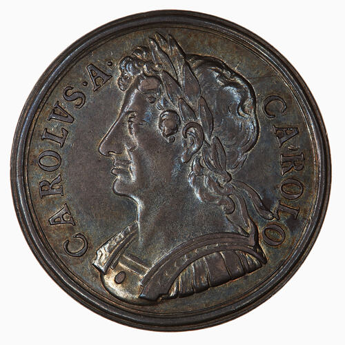 Laureate bust of Charles II wearing armour, facing left; around, CAROLVS . A . COROLO