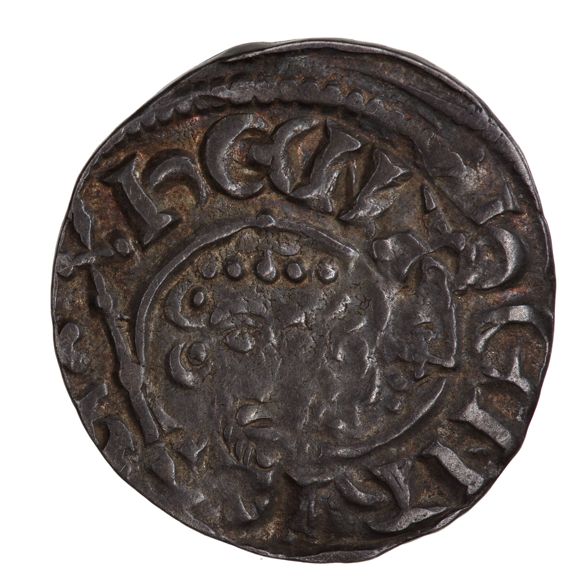 A short cross voided within a beaded circle, a quatrefoil in each angle; around, + ..EL ON LVN - double struck