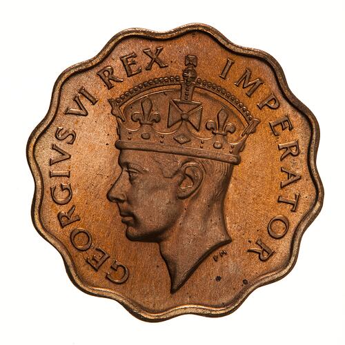 Crowned head of George VI facing left; around, GEORGIVS VI REX IMPERATOR; atist's initials, PM, below neck truncation