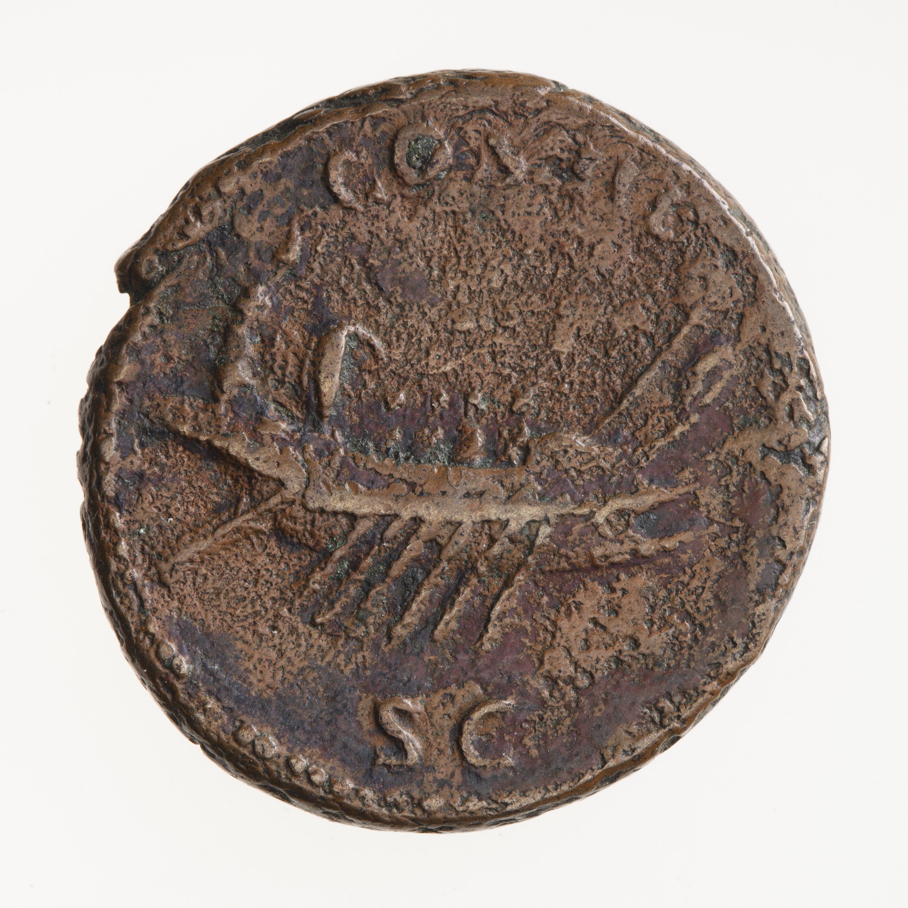 Ship with rowers sailing to right; above, COS III; below, S C