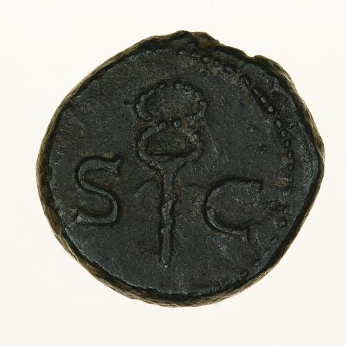 Anonymous Quadrans struck between the reign of the Emperors Domitian and Antoninus Pius in the period 81-161 AD. Minted by Rome, Ancient Roman Empire. RIC lists eleven different groups of Anonymous quadrantes (or tessarae) bearing the letters SC. This piece belongs to its Group IX - Mercury.
