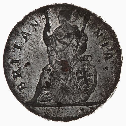 Britannia seated facing left on a globe, extending an olive branch and holding a spear, her left hand rests on a shield decorated with the crosses of St. George and St. Andrew; around, BRITANNIA.