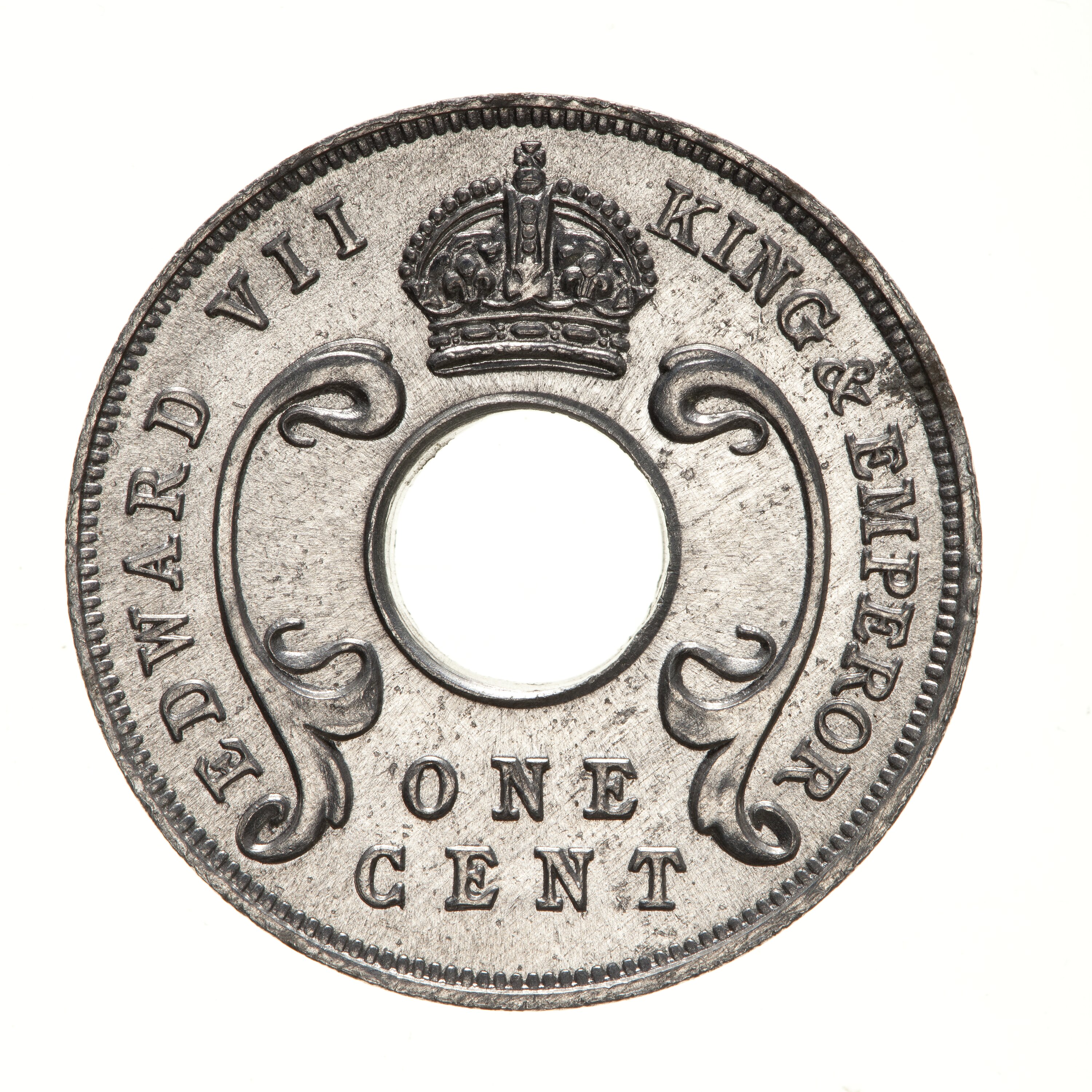 A central hole with curved floral design to left and right; above hole, crown; below hole in two lines, ONE / CENT; around, EDWARD VII KING & EMPEROR