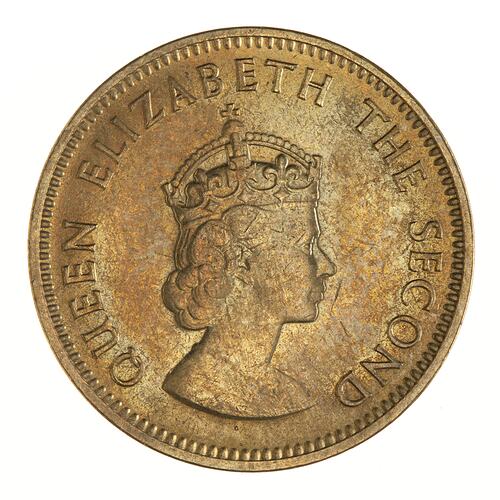 Crowned and draped bust facing right, around above, QUEEN ELIZABETH THE SECOND