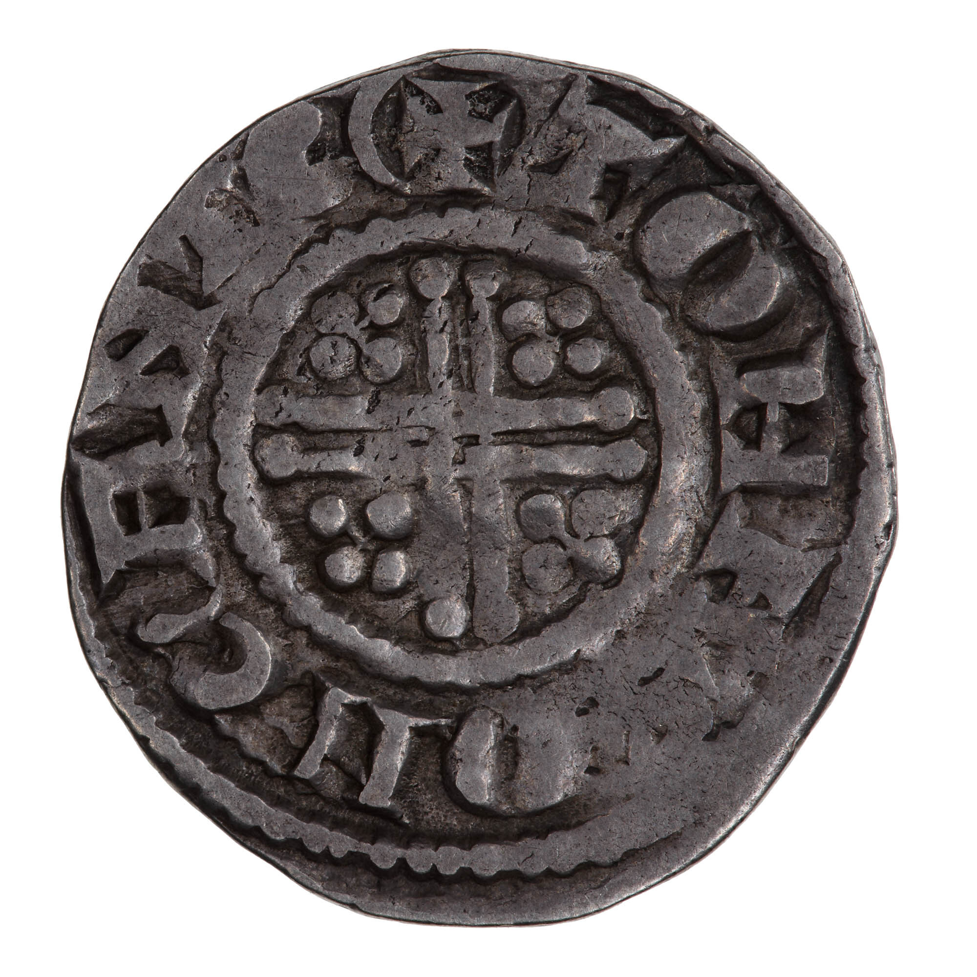 A short cross voided within a beaded circle, a quatrefoil in each angle; around, + TOMAS ON CANTE