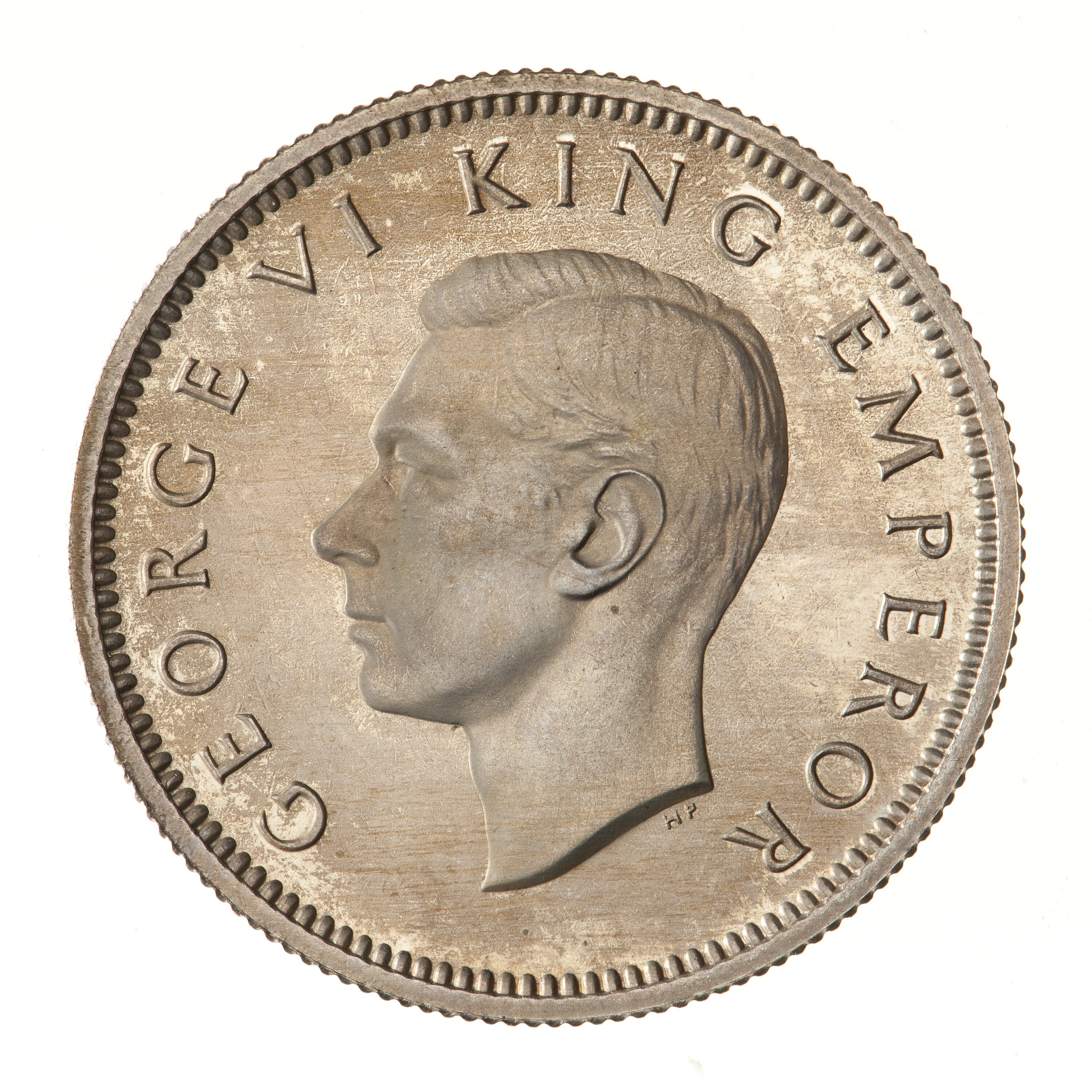 King's head, bare, facing left; around, GEORGE VI KING EMPEROR; below neck truncation in small letters the artist's initials HP ([Thomas] Humphrey Paget)