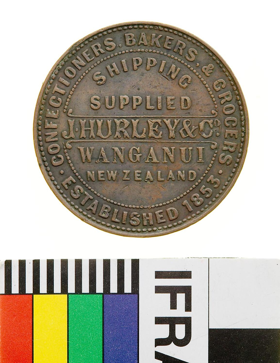 Bronze One Penny Token, minted by Todman, London. Issued by J. Hurley & Co, Wanganui, circa 1875. John Hurley migrated to New Zealand with his parents and siblings in 1842, at the age of 12. They settled in Wellington where his father, Alexander, ran a bakery on Lambton Quay. In 1853 John moved to Wanganui and opened his own bakery. His range of goods included bread, biscuits, confectionery and groceries; he also supplied ships. He married a local woman, Lorenna Cunnabel, on January 24, 1855 at Brunswick Station, a few miles from the town. They had four children. Hurley sold his business on the 8th of January 1857 to a wealthy local man, Mr Joseph Augustus Burnett. However in 1864 he bought it back. The same year Hurley's brother Henry arrived in Wanganui. An almanac advertisement from 1878 showed how John Hurley's business had expanded. As well as bread, biscuits and confectionery, he also listed wholesale and retail grocery and emphasised his ability to create wedding cakes. Hurley later built a much more substantial bakery, a two storey, double fronted wooden building with glass across the front.