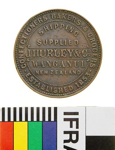 A round bronze token (31 mm diameter). The piece features the name, address and business of the issuer: J. Hurley & Co. confectioner, baker and grocer in Wanganui. The reverse features a seated female figure holding an anchor in her left hand and extending her right above bales, a bee-hive set on a stand through which an inverted cornucopiae spills fruit on the ground. To the right is a cliff with wheat sheaves at its base and on the left near the horizon of the sea, a three-masted sailing ship.