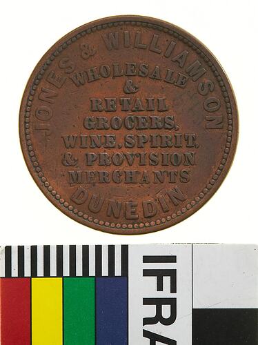 Obverse: JONES & WILLIAMSON WHOLESALE & RETAIL GROCERS, WINE, SPIRIT & PROVISION MERCHANTS DUNEDIN Reverse: NEW ZEALAND 1858