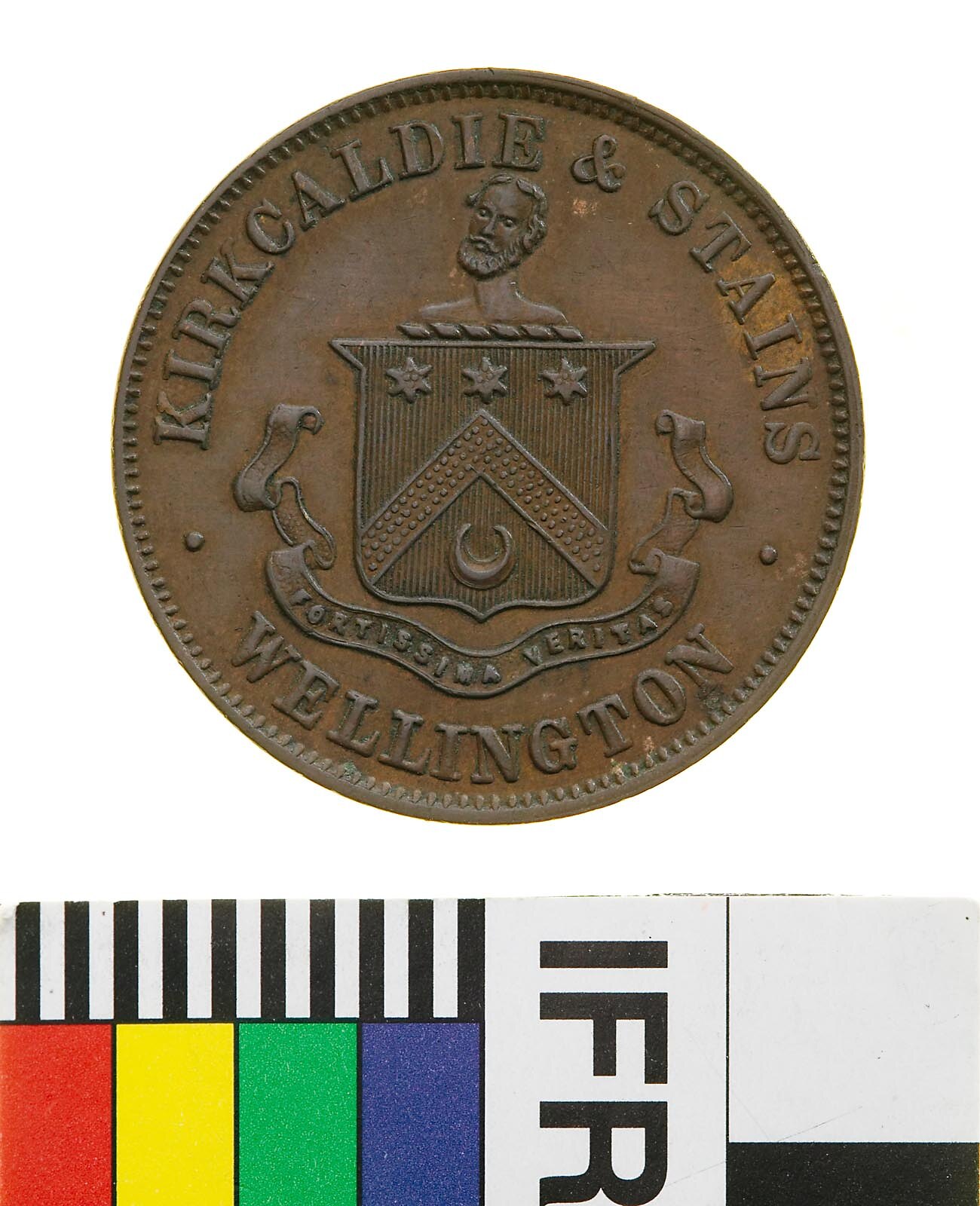 A round bronze token (31 mm diameter). The piece features the name, address and business of the issuer: Kirkcaldie & Stains, general drapers and outfitters, Wellington. The reverse features a coat of arms with a bearded bust as crest (John Kirkcaldie?).