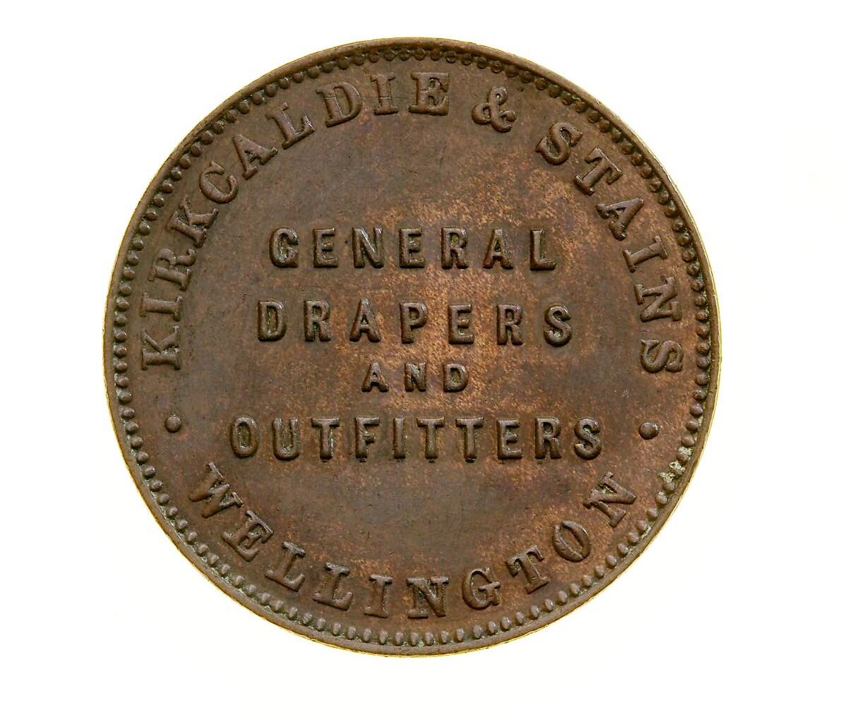 Obverse: KIRKCALDIE & STAINS GENERAL DRAPERS AND OUTFITTERS WELLINGTON Reverse: KIRKCALDIE WELLINGTON FORTISSIMA VERITAS
