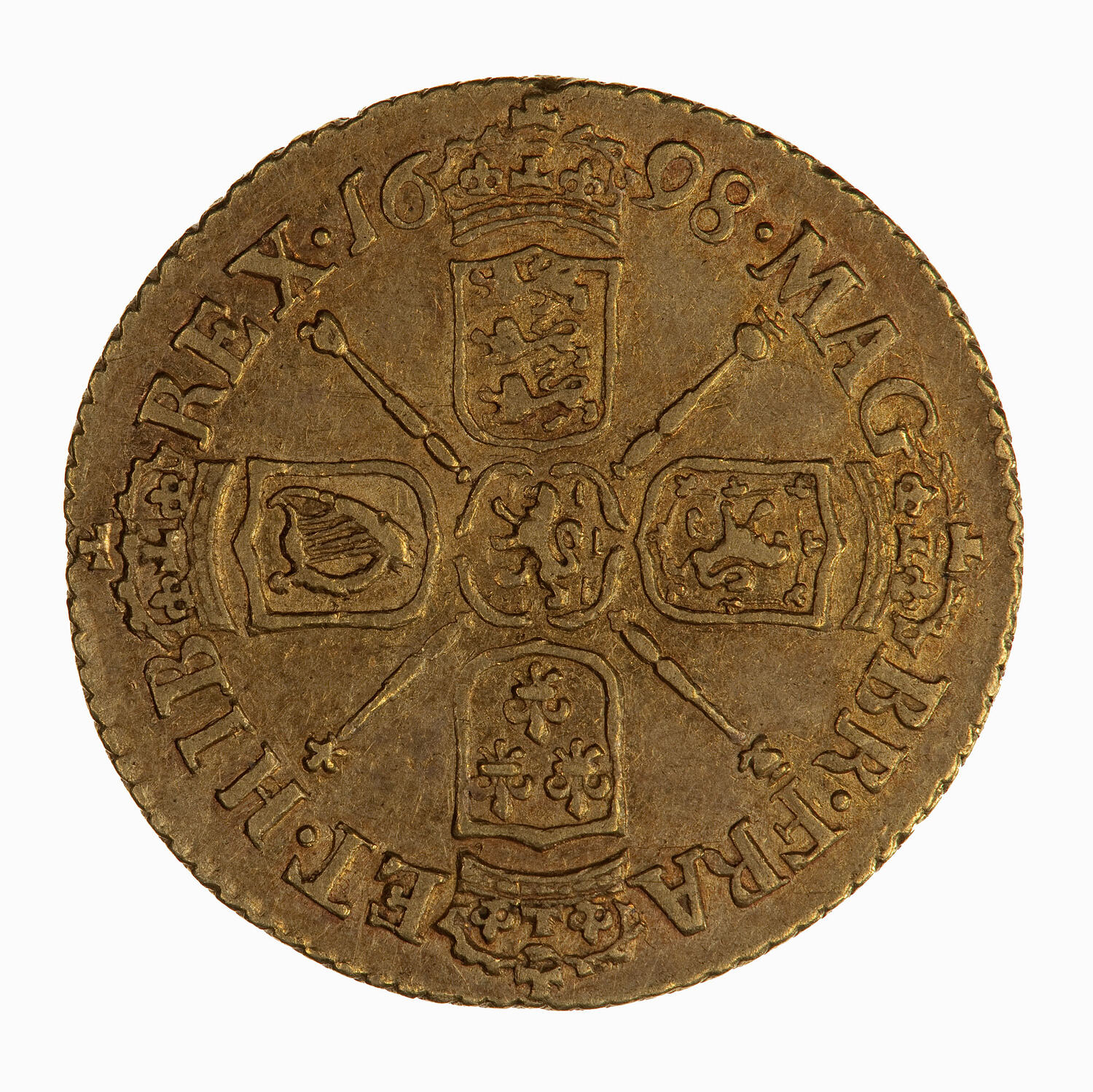 Crowned shields of England, Scotland, Ireland and France forming a cross shape, with the arms of the House Nassau at the centre. In the angles between the shields are four sceptres with different heads, an orb, a thistle, a lis and a harp; around, MAG. BR. FRA ET. HIB REX 1698, the date being divided by the crown above the English arms.