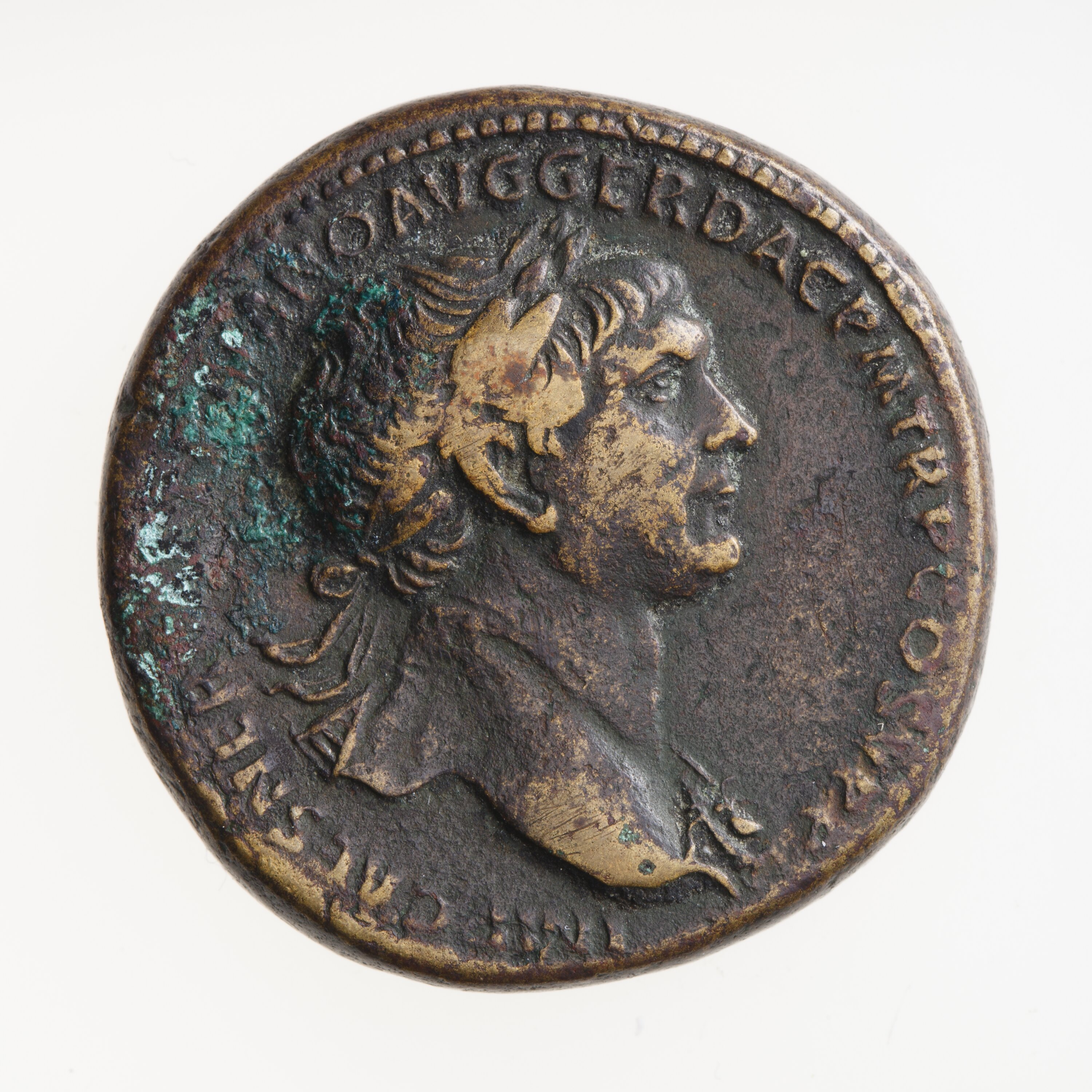 Laureate head of Trajan facing right wearing aegis; around, IMP CAES NERV[AE TRAI]ANO AVG GER DAC P M TR P COS V P P