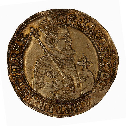 Crowned half-length figure of the King facing right wearing decorated armour and holding a sceptre tipped with a lis and orb; around, (Mm. cinquefoil) IACOBVS D G MA BRI FRA ET HI REX (translation: James by the Grace of God King of Great Britain France and Ireland)