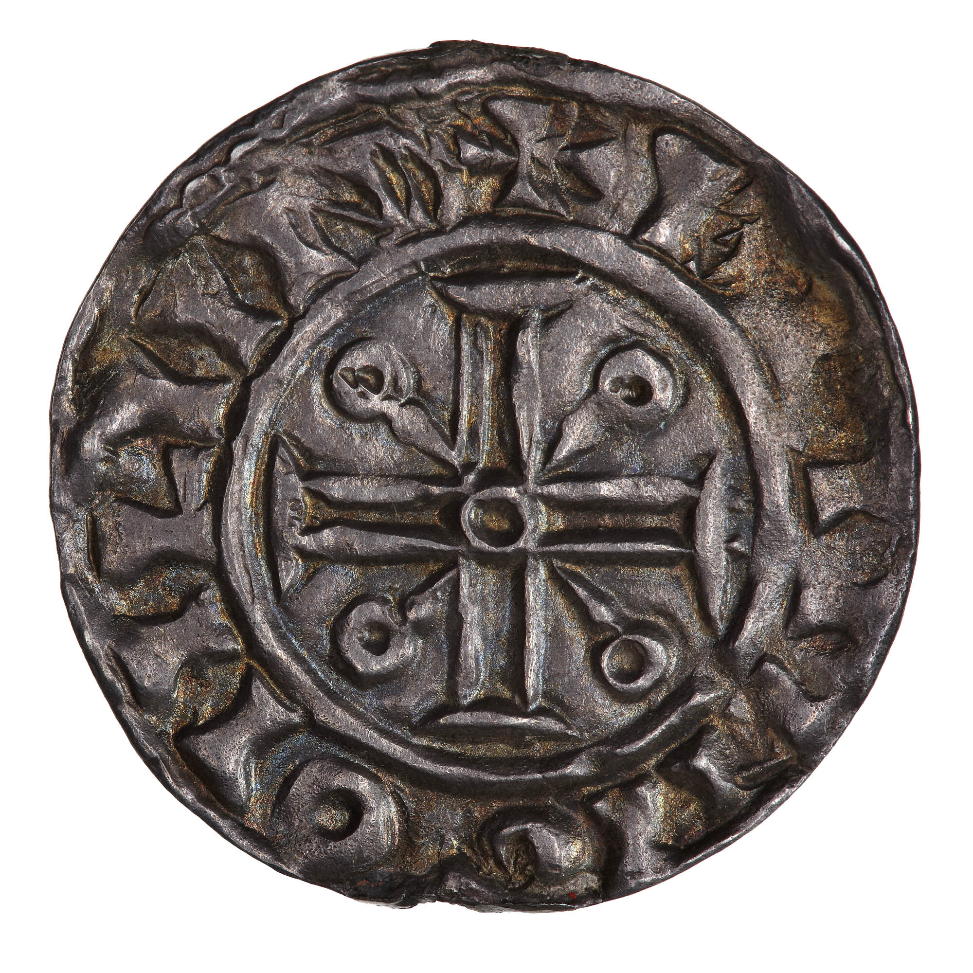 Within a line circle, a voided cross pattee with an annulet at the centre over a cross annulettee; around, + MANNIC ON LVN (some double striking on the reverse)