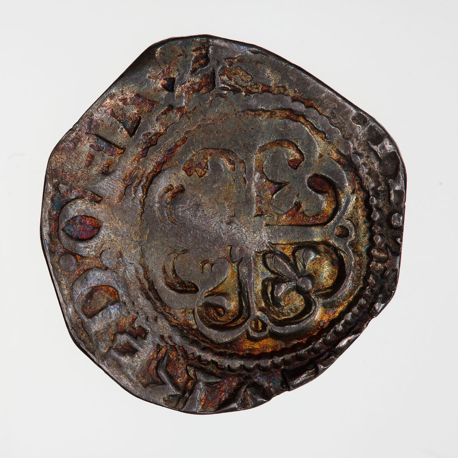 At the centre within a line circle a cross moline with a fleur-de-lis in each angle; around; [+..]VRED OF LVN