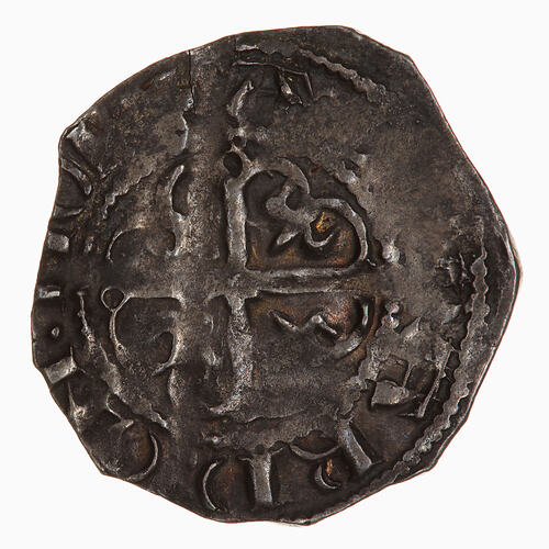 At centre, within a line circle a cross moline with a fleur-de-lis in each angle; text around; [..]ARD ON. N[..] (letters on both sides are quite difficult or impossible to read being either weakly struck up or off the flan). Design poorly struck up because of the erasure on the obverse die.