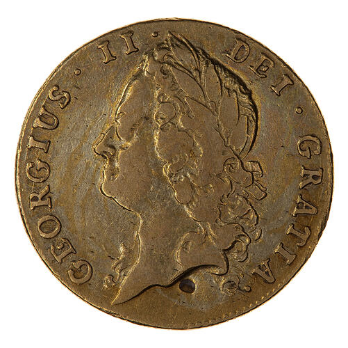Intermediate laureate head of George II facing left; around, GEORGIVS . II . DEI . GRATIA .
