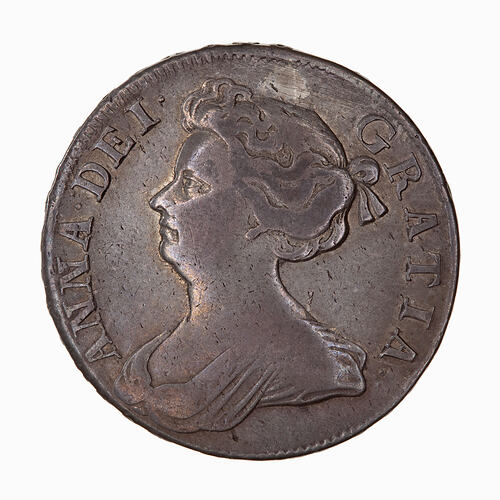 Bust of Anne left; around, ANNA DEI GRATIA (holed and plugged above Queen's head)