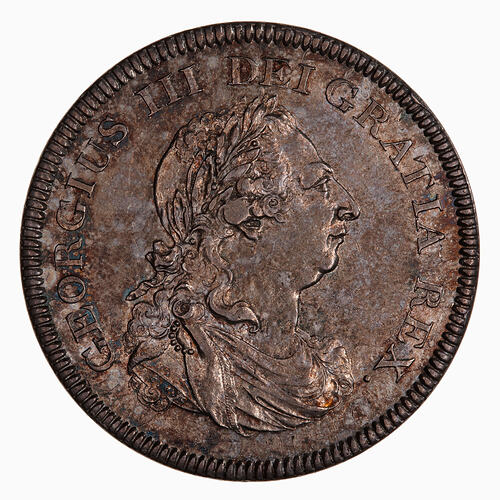 Laureate and drapes bust of the King facing right; around, GEORGIUS III DEI GRATIA REX