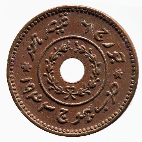 Around central hole, within line circle, an open wreath; legend in Persian (includes date AD 1943, the name of George VI and the mint name Bhuj)