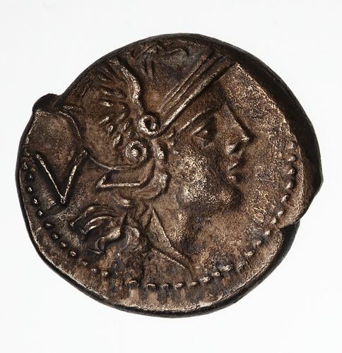 Bust of Roma wearing winged helmet facing right; behind, V; border of dots