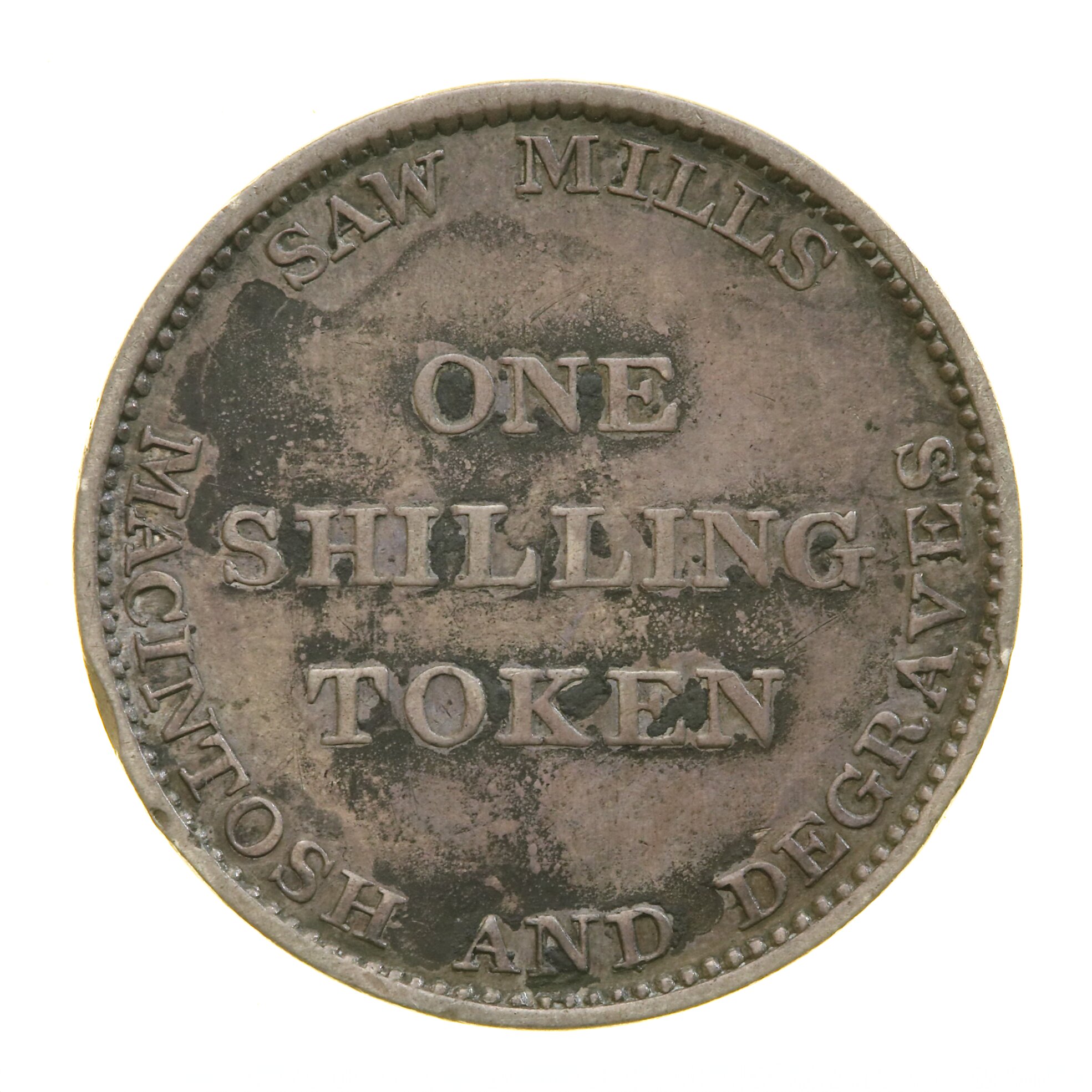 At centre in three lines, ONE / SHILLING / TOKEN around below, MACINTOSH & DEGRAVES around above, SAW MILLS.