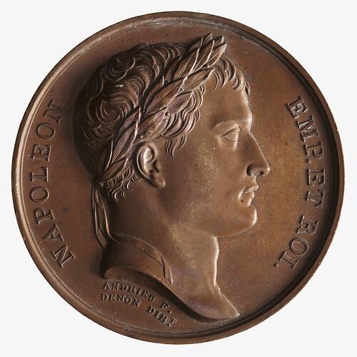 Laureate head facing right; around, NAPOLEON EMP. ET ROI.; below, ANDRIEU F. / DENON DIRT.